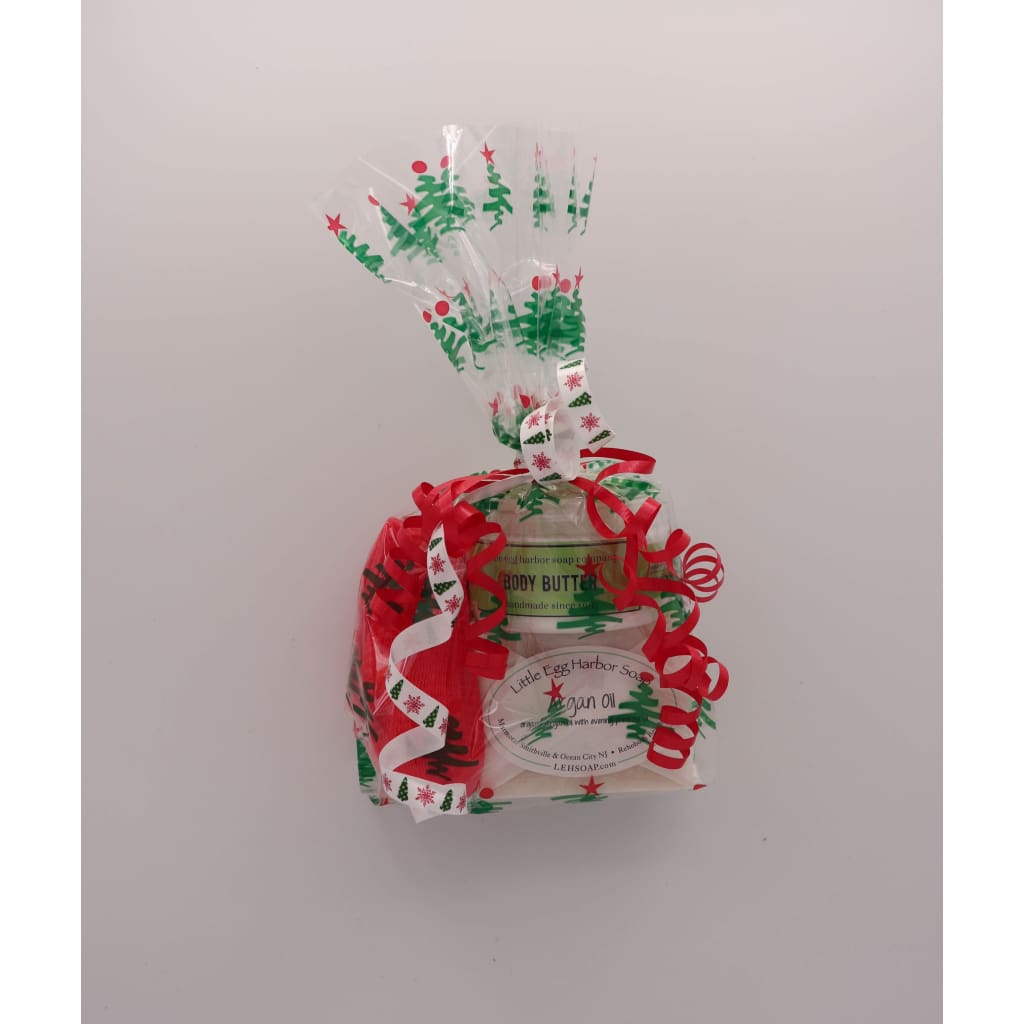 Gift bag includes 1 (4oz) argan & avocado body butter, argan oil soap (3oz), avocado oil soap (3oz) and a soap saver (various color).