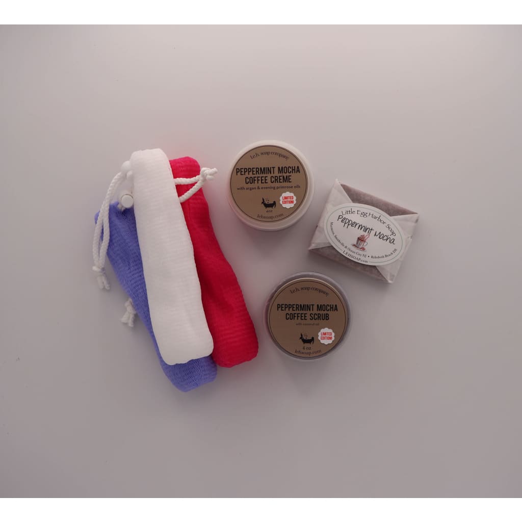 This set includes 1 (4oz) Peppermint Mocha Coffee Scrub, 1 (4oz) Peppermint Mocha Coffee Creme and 1 (3oz) bar of peppermint mocha soap.